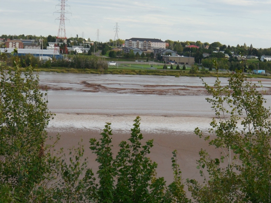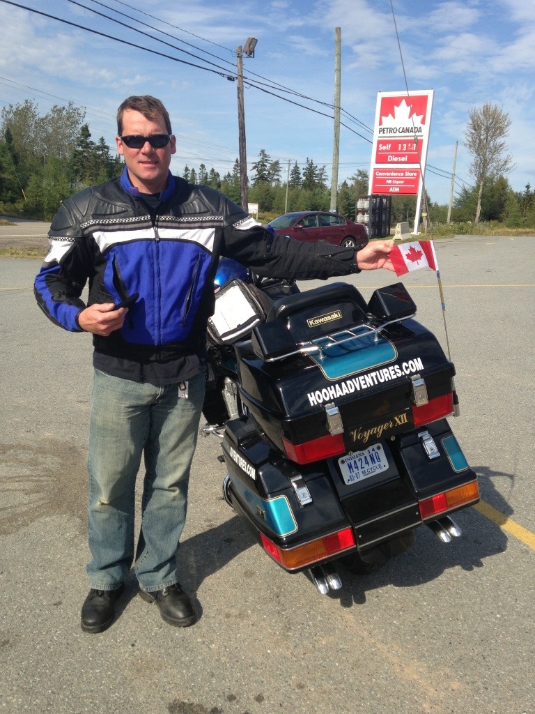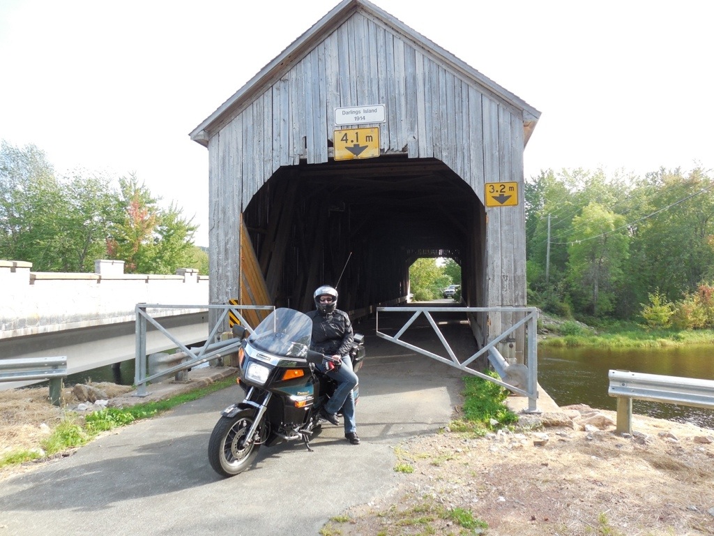 We got on the bike again, geared up in our rain suits ready for whatever Mother Nature threw at us. We were driving on the main highway 104 as it started to pour. The rain gear seemed to be working, as long as you had it zipped up all the way and all the Velcro shut. We saw a sign with a gas pump, so we turned off thinking we would fill up quickly and get back on the road. Well, in Canada, if you don’t see the gas pump from the road, don’t turn off, because we ended up driving backwards almost to Pictou for gas ( probably 15km). In a downpour. So, we fueled up, looked at the map, and looked more direct at this point to travel route 6 to Amherst. In a downpour. Oh, and RainX only works when you are going 65mph. Anyway, the views would have been beautiful in nicer weather, along the Northumberland Strait. Seaside homes, farms, rolling terrain. Sorry, no pics because we were in a downpour. We got to Amherst and stood under the overpass for a little break.