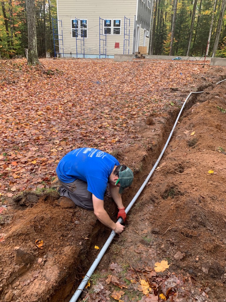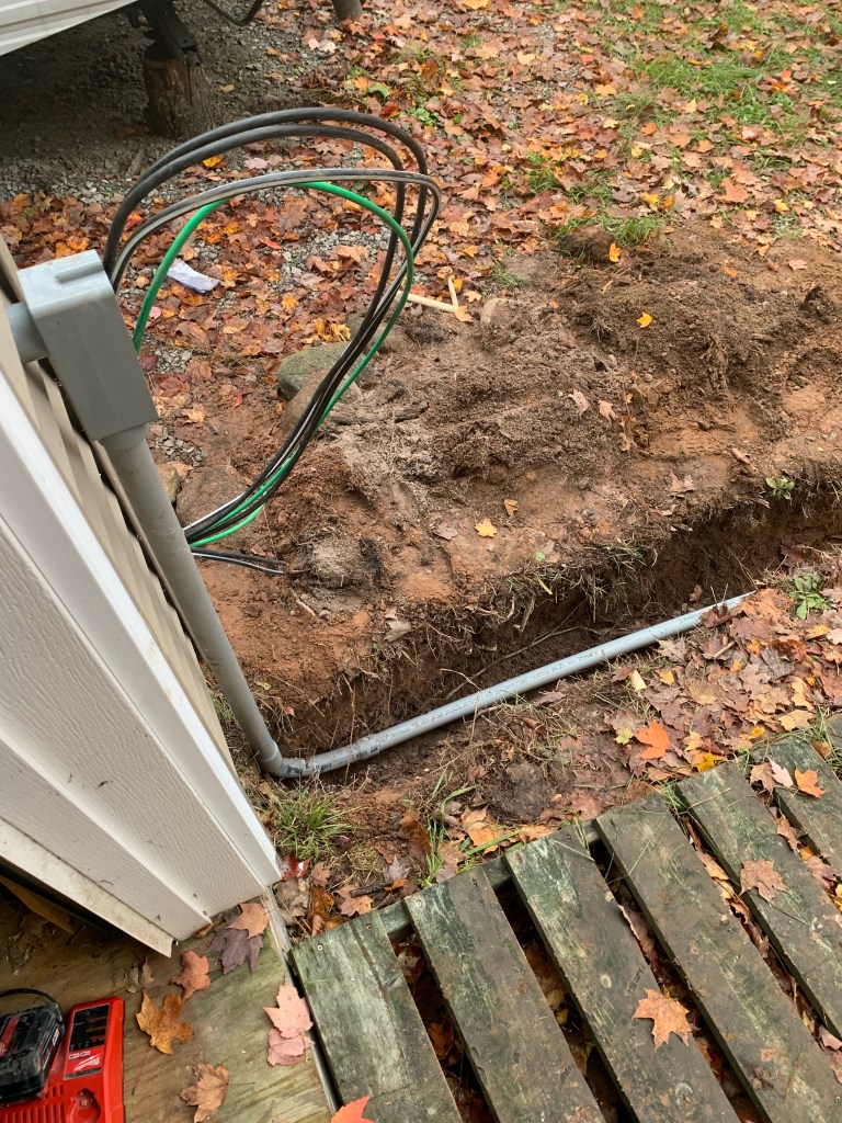 We dug a trench from the electrical panel in the shed, about 140 feet, to bury wire in conduit to the panel inside the cabin.