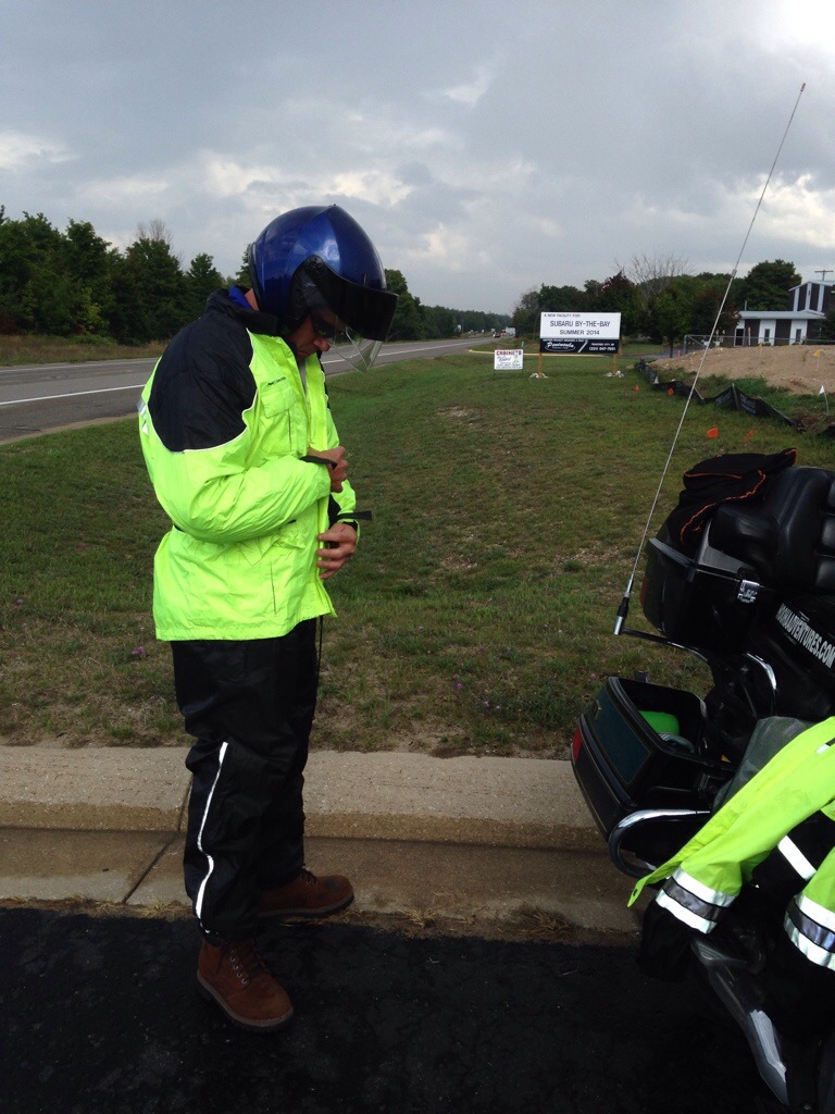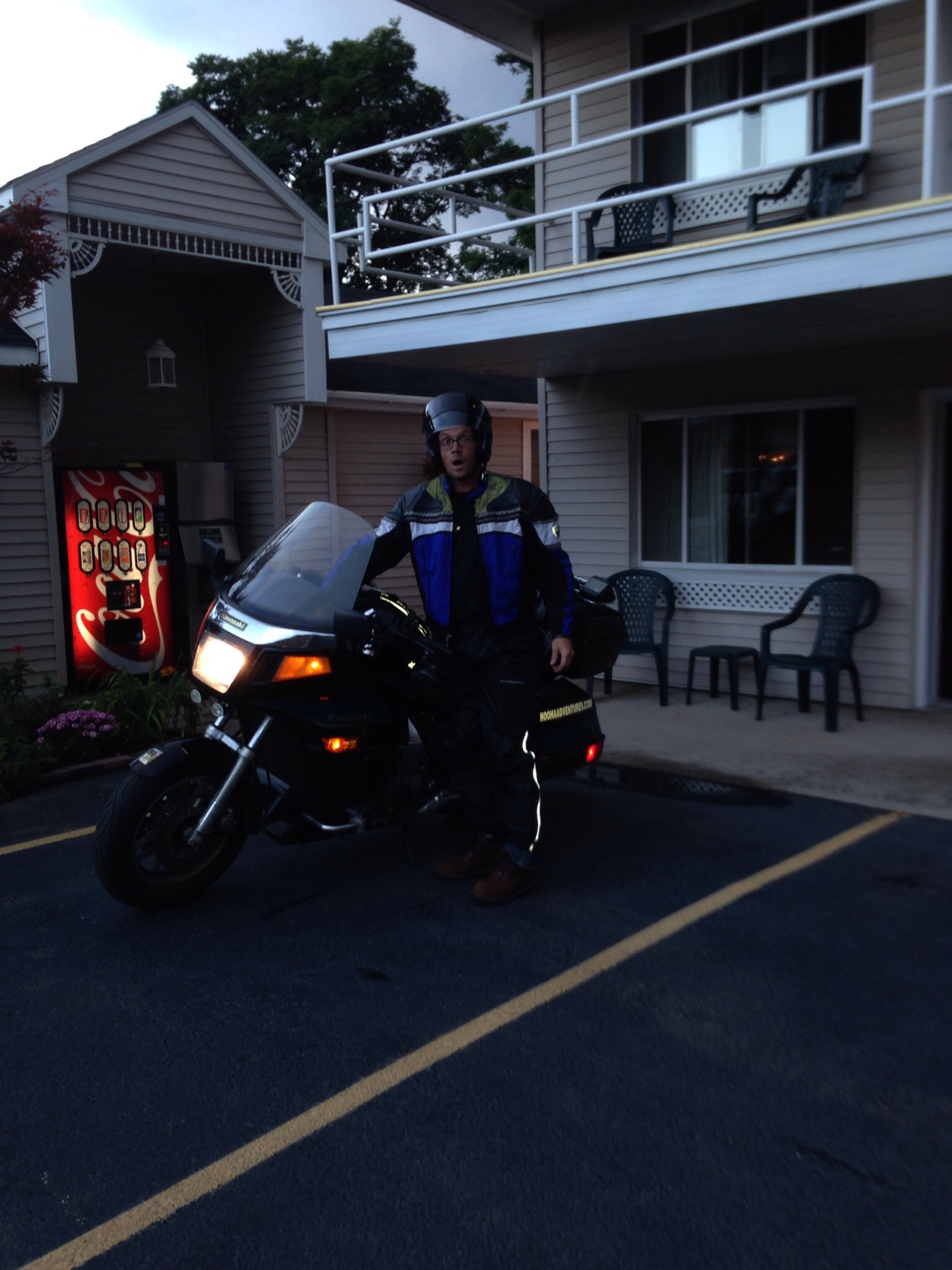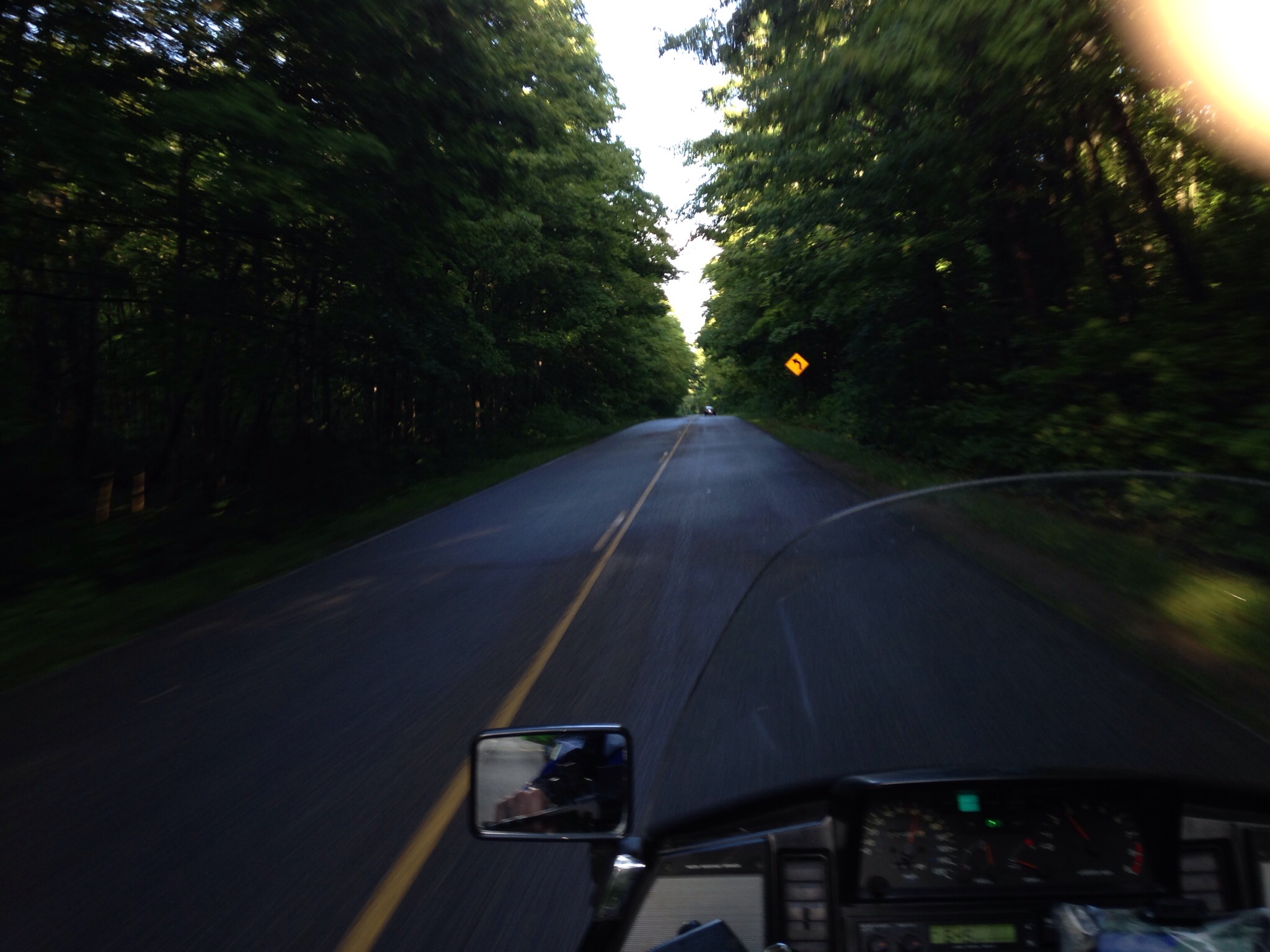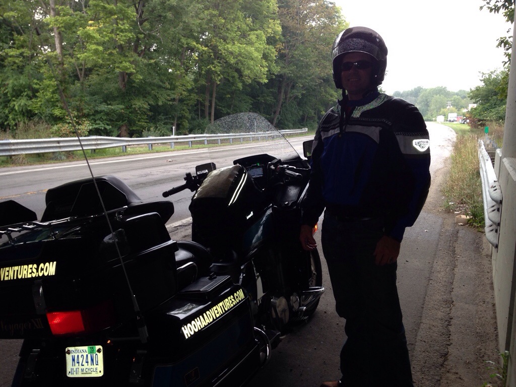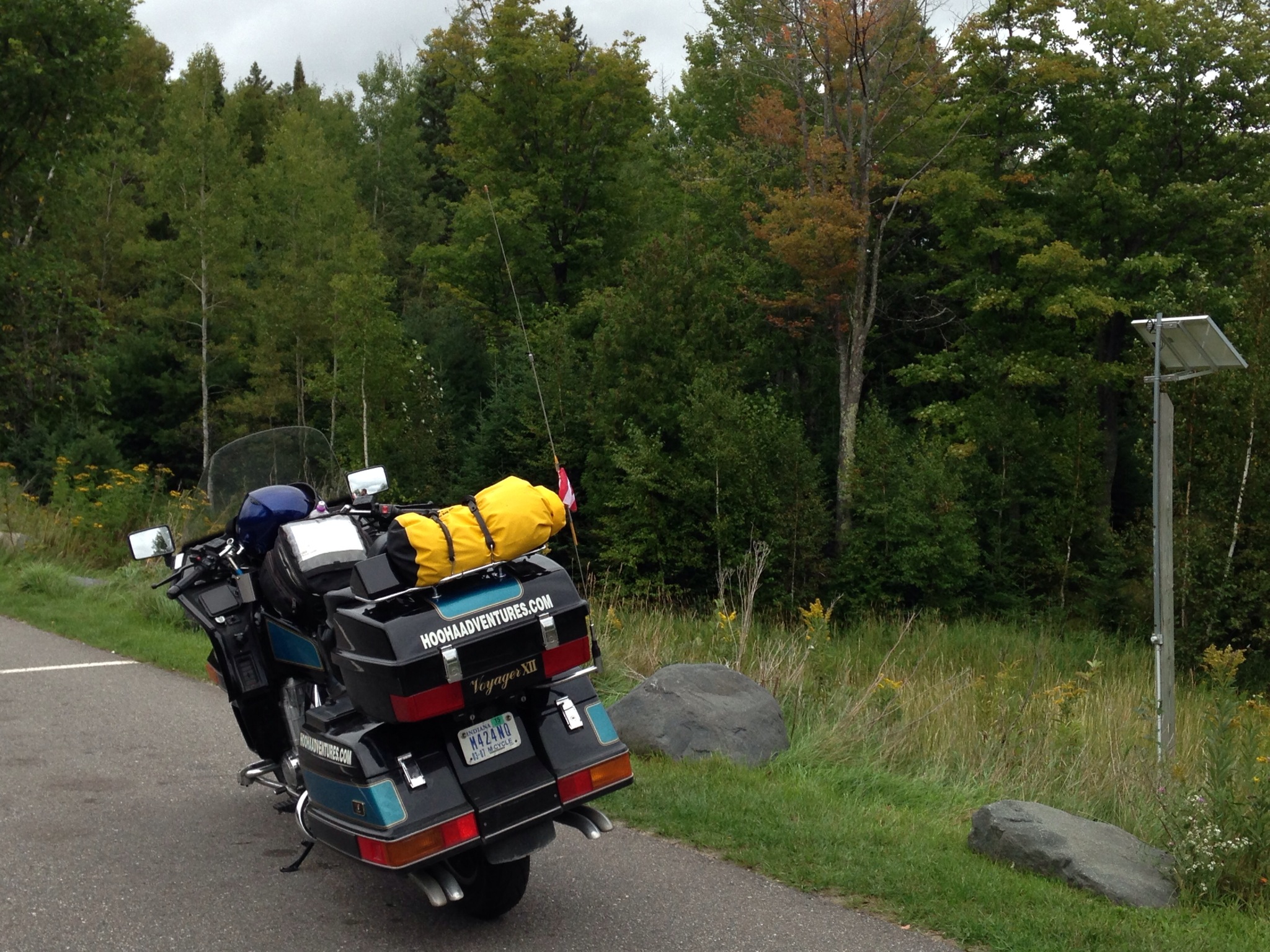 It’s been a long year since the last big adventure to Cape Breton. We headed out after our packing, errands and work around 2:00. The weather was partly cloudy, and a little breeze to make the riding comfortable with coats and gear. We traveled 69 to 94 until we got off the highway for gas in Galesburg. The sky was getting blacker and people at the gas station remarked “hope you are going East”. We started off as it began to rain lightly and stopped under an overpass to let the weather go past us.